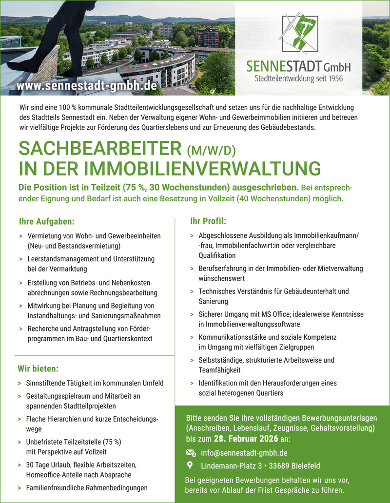 Als Klimaquartier ist die Sennestadt ein besonderer Laborraum, um für ein nachhaltiges Bielefeld modellhafte Projekte, Kooperationen, Verfahren, Technologien und Finanzierungsmodelle zu entwickeln, zu erproben und zu vermitteln.